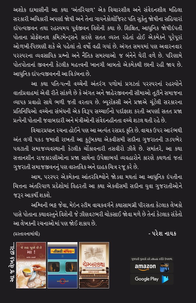 અશોક દામાણીની આ કથા ‘અંતરિયાળ’ એક વિચારશીલ અને સંવેદનશીલ મહિલા સરકારી અધિકારી અપર્ણા જોષી અને તેના ગાયનેકોલૉજિસ્ટ પતિ સુકેતુ જોષીના સહિયારાં દાંપત્યજીવન તથા રહસ્યમય પૂર્વજીવન વિશેની કથા છે. શિક્ષિત, આધુનિક જોષીદંપતી પોતાના પ્રોફૅશનલ કમિટમેન્ટ્સને કારણે સતત વ્યસ્ત રહેતાં હોઈ એકમેકને પૂરેપૂરાં ઓળખી-પિછાણી શકે એ પહેલાં તો વર્ષો વહી ગયાં છે. અંગત સમયમાં પણ અવારનવાર પરસ્પરના વ્યવસાયિક પ્રશ્નો અને નૈતિક સમસ્યાઓ જ બંનેને ઘેરી વળે છે. પરિણામે પોતપોતાનાં જીવનની કેટલીક મહત્ત્વની ખાનગી બાબતો એકમેકથી છાની રહી જાય છે. આધુનિક દાંપત્યજીવનની આ વિડંબના છે. આ કથા પતિ-પત્ની વચ્ચેની અંતરંગ પળોમાં પ્રગટતાં પરસ્પરનાં રહસ્યોને વાર્તાપ્રવાહમાં એવી રીતે સાંકળે છે કે અંગત અને જાહેરજીવનની સીમાઓ તૂટીને સમાજના વ્યાપક પ્રવાહો સાથે ભળી જતી વરતાય છે. કથાકથનની આ પ્રયુક્તિ લેખકને એકવીસમી સદીના ગુજરાતી નૈતિક, સામાજિક અને રાજકીય મૂલ્યો વિશેની ઠેઠ હમણાં હમણાંની પરિસ્થિતિ નિરૂપવા પ્રેરે છે. બ્યૂરૉક્રસી અને પ્રજાએ ચૂંટેલી સરકારના પ્રતિનિધિઓ વચ્ચેના સંબંધની એક વિરૂપ સચ્ચાઈનો પર્દાફાશ કરતી અપર્ણા સતત પ્રજા પ્રત્યેની પોતાની જવાબદારી અને મંત્રીઓની સંવેદનહીનતા વચ્ચે શટલ થતી રહે છે. રાજસત્તા સાથે અવિભાજ્ય રૂપે જોડાયેલી ધર્મસત્તાને કારણે અપર્ણા અને સુકેતુ વર્તમાન સમાજમાં વધુ ને વધુ વકરતી દંભી ધાર્મિકોની અંધ સત્તા પ્રત્યે આક્રોશ વ્યક્ત કરે છે.