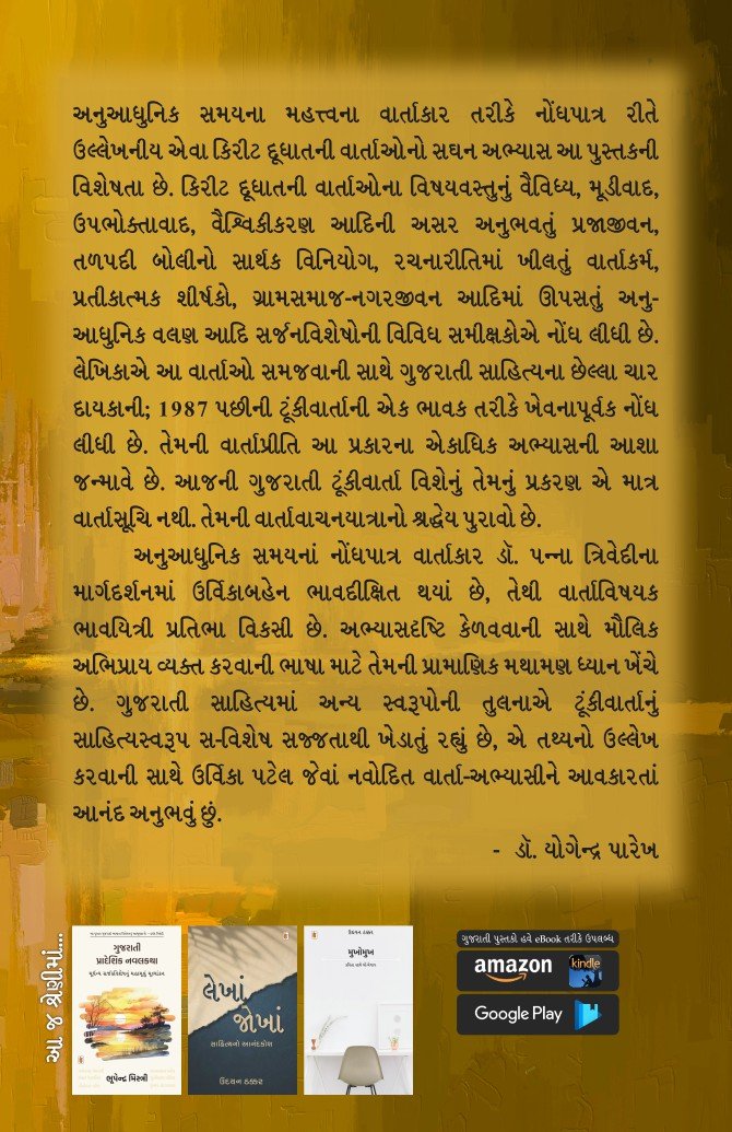 અનુઆધુનિક સમયના મહત્ત્વના વાર્તાકાર તરીકે નોંધપાત્ર રીતે ઉલ્લેખનીય એવા કિરીટ દૂધાતની વાર્તાઓનો સઘન અભ્યાસ આ પુસ્તકની વિશેષતા છે. કિરીટ દૂધાતની વાર્તાઓના વિષયવસ્તુનું વૈવિધ્ય, મૂડીવાદ, ઉપભોક્તાવાદ, વૈશ્વિકીકરણ આદિની અસર અનુભવતું પ્રજાજીવન, તળપદી બોલીનો સાર્થક વિનિયોગ, રચનારીતિમાં ખીલતું વાર્તાકર્મ, પ્રતીકાત્મક શીર્ષકો, ગ્રામસમાજ-નગરજીવન આદિમાં ઊપસતું અનુ-આધુનિક વલણ આદિ સર્જનવિશેષોની વિવિધ સમીક્ષકોએ નોંધ લીધી છે. લેખિકાએ આ વાર્તાઓ સમજવાની સાથે ગુજરાતી સાહિત્યના છેલ્લા ચાર દાયકાની; 1987 પછીની ટૂંકીવાર્તાની એક ભાવક તરીકે ખેવનાપૂર્વક નોંધ લીધી છે. તેમની વાર્તાપ્રીતિ આ પ્રકારના એકાધિક અભ્યાસની આશા જન્માવે છે. આજની ગુજરાતી ટૂંકીવાર્તા વિશેનું તેમનું પ્રકરણ એ માત્ર વાર્તાસૂચિ નથી. તેમની વાર્તાવાચનયાત્રાનો શ્રદ્ધેય પુરાવો છે.