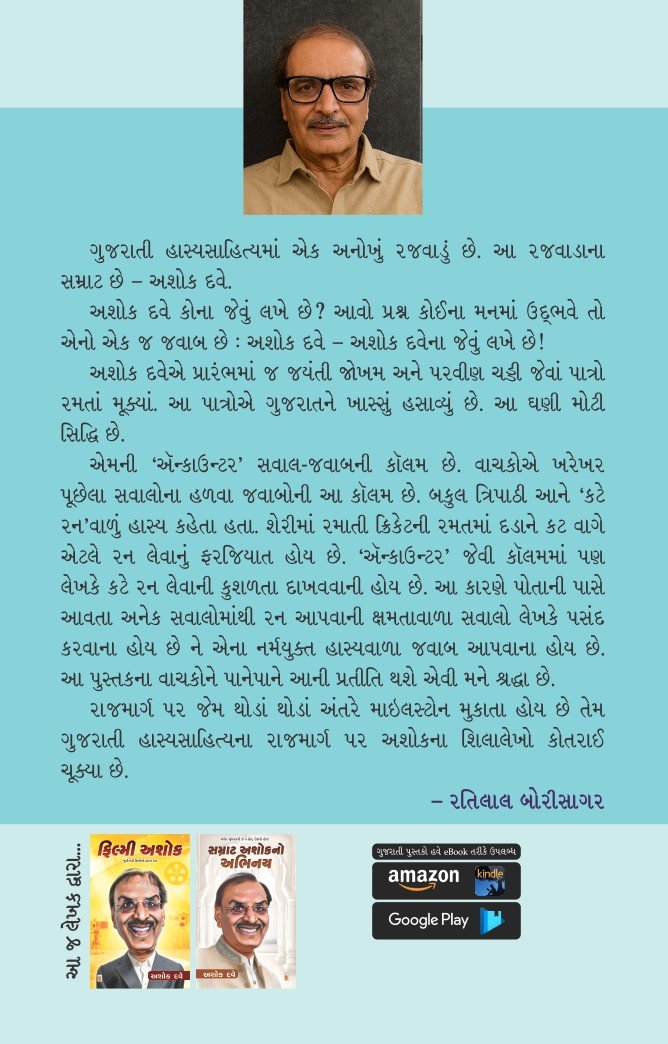 એમની `ઍન્કાઉન્ટર’ સવાલ-જવાબની કૉલમ છે. વાચકોએ ખરેખર પૂછેલા સવાલોના હળવા જવાબોની આ કૉલમ છે. બકુલ ત્રિપાઠી આને `કટે રન’વાળું હાસ્ય કહેતા હતા. શેરીમાં રમાતી ક્રિકેટની રમતમાં દડાને કટ વાગે એટલે રન લેવાનું ફરજિયાત હોય છે. ‘ઍન્કાઉન્ટર’ જેવી કૉલમમાં પણ લેખકે કટે રન લેવાની કુશળતા દાખવવાની હોય છે. આ કારણે પોતાની પાસે આવતા અનેક સવાલોમાંથી રન આપવાની ક્ષમતાવાળા સવાલો લેખકે પસંદ કરવાના હોય છે ને એના નર્મયુક્ત હાસ્યવાળા જવાબ આપવાના હોય છે. આ પુસ્તકના વાચકોને પાનેપાને આની પ્રતીતિ થશે એવી મને શ્રદ્ધા છે.