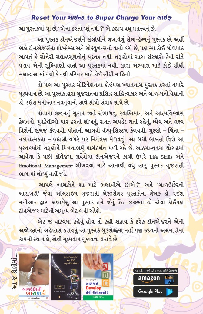 Reset Your માઇન્ડ to Super Charge Your લાઇફ આ પુસ્તકમાં ‘શું છે,’ એના કરતાં ‘શું નથી?’ એ કદાચ વધુ મહત્ત્વનું છે. આ પુસ્તક ટીનએજર્સને સંબોધીને લખાયેલું સેલ્ફ-હેલ્પનું પુસ્તક છે. અહીં ભલે ટીનએજર્સના પ્રૉબ્લેમ્સ અને સૉલ્યુશન્સની વાતો કરી છે, પણ આ કોઈ બોધપાઠ આપતું કે સોનેરી સલાહસૂચનોનું પુસ્તક નથી. તરૂણોમાં સારા સંસ્કારો કેવી રીતે પડાય એની સૂફિયાણી વાતો આ પુસ્તકમાં નથી. સારા અભ્યાસ માટે કોઈ સીધી સલાહ આમાં નથી કે નથી કરિયર માટે કોઈ સીધી માહિતી. તો પણ આ પુસ્તક મોટિવેશનના કોઈપણ ખ્યાતનામ પુસ્તક કરતાં વધારે મૂલ્યવાન છે. આ પુસ્તક દ્વારા ગુજરાતના પ્રસિદ્ધ સાહિત્યકાર અને બાળ-મનોવિજ્ઞાની ડૉ. રઈશ મનીઆર નવયુવાનો સાથે સીધો સંવાદ સાધે છે. પોતાના જીવનનું સુકાન જાતે સંભાળવું, સ્વાભિમાન અને આત્મવિશ્વાસ કેળવવો, મુશ્કેલીઓ પાર કરતાં શીખવું, સતત અપડેટ થતાં રહેવું, ધ્યેય અને લક્ષ્ય વિશેની સમજ કેળવવી, પોતાની આગવી વૅલ્યૂ-સિસ્ટમ કેળવવી, ગુસ્સો – ચિંતા – નકારાત્મકતા – ઉદાસી વગેરે પર નિયંત્રણ મેળવવું.. આ બધી બાબતો વિશે આ પુસ્તકમાંથી તરૂણોને મિત્રતાભર્યું માર્ગદર્શન મળી રહે છે. આઠમા-નવમા ધોરણમાં આવેલા કે પછી કૉલેજમાં પ્રવેશેલા ટીનએજરને કાચી ઉંમરે Life Skills અને Emotional Management શીખવવા માટે આનાથી વધુ સારું પુસ્તક ગુજરાતી ભાષામાં શોધ્યું નહીં જડે. ‘આપણે બાળકોને શા માટે ભણાવીએ છીએ?’ અને ‘બાળઉછેરની બારાખડી’ જેવા ઑલટાઇમ ગુજરાતી બેસ્ટસેલર પુસ્તકોના લેખક ડૉ. રઈશ મનીઆર દ્વારા લખાયેલું આ પુસ્તક તમે જેનું હિત ઇચ્છતા હો એવા કોઈપણ ટીનએજર માટેની અમૂલ્ય ભેટ બની રહેશે. એક જ વાક્યમાં કહેવું હોય તો કહી શકાય કે દરેક ટીનએજરને એની અજોડતાનો અહેસાસ કરાવતું આ પુસ્તક બુકશેલ્ફ્માં નહીં પણ હૃદયની અલમારીમાં કાયમી સ્થાન લે, એવી મૂલ્યવાન ગુણવત્તા ધરાવે છે.