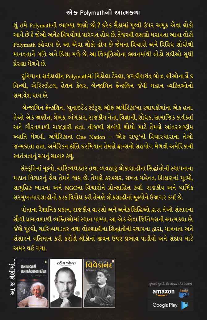 એક Polymathની આત્મકથા શું તમે Polymathની વ્યાખ્યા જાણો છો? દરેક સૈકામાં પૃથ્વી ઉપર અમૂક એવા લોકો આવે છે કે જેઓ અનેક વિષયોમાં પારંગત હોય છે. તેજસ્વી લક્ષણો ધરાવતા આવા લોકો Polymath કહેવાય છે. આ એવા લોકો હોય છે જેમના વિચારો અને વિવિધ શોધોથી માનવતાને ગતિ અને દિશા મળે છે. આ વિભૂતિઓના જીવનમાંથી લોકો સદીઓ સુધી પ્રેરણા મેળવે છે. દુનિયાના સર્વકાલીન Polymathમાં નિકોલા ટેસ્લા, જગદીશચંદ્ર બોઝ, લીઓનાર્ડો દ વિન્ચી, એરિસ્ટોટલ, હેલન કેલર, બેન્જામિન ફ્રેન્કલિન જેવી મહાન વ્યક્તિઓનો સમાવેશ થાય છે. બેન્જામિન ફ્રેન્કલિન, `યુનાઈટેડ સ્ટેટ્સ ઑફ અમેરિકા’ના સ્થાપકોમાંના એક હતા. તેઓ એક જાણીતા લેખક, વ્યંગકાર, રાજકીય નેતા, વિજ્ઞાની, શોધક, સામાજિક કાર્યકર્તા અને ગૌરવશાળી રાજદ્વારી હતા. વીજળી સંબંધી શોધો માટે તેમણે આંતરરાષ્ટ્રીય ખ્યાતિ મેળવી. અમેરિકાના One Nation – `એક રાષ્ટ્ર’ની વિચારધારાના તેઓ જન્મદાતા હતા. અમેરિકન ક્રાંતિ દરમિયાન તેમણે ફ્રાન્સનો સહયોગ મેળવી અમેરિકાની સ્વતંત્રતાનું સપનું સાકાર કર્યું. સંસ્કૃતિનાં મૂલ્યો, ચારિત્ર્યઘડતર તથા વ્યવહારુ લોકાશાહીના સિદ્ધાંતોની સ્થાપનાના મહાન વિચારનું શ્રેય તેમને જાય છે. તેમણે કરકસર, સખત મહેનત, શિક્ષણનાં મૂલ્યો, સામુહિક ભાવના અને NGOના વિચારોને પ્રોત્સાહિત કર્યા. રાજકીય અને ધાર્મિક સરમુખત્યારશાહીનો કડક વિરોધ કરી તેમણે લોકશાહીનાં મૂલ્યોને ઉજાગર કર્યાં છે. પોતાના વૈજ્ઞાનિક પ્રદાન, રાજકીય વારસો અને અનેક સિદ્ધિઓ દ્વારા તેઓ સંસારના સૌથી પ્રભાવશાળી વ્યક્તિઓમાં સ્થાન પામ્યા. આ એક એવા જિનિયસની આત્મકથા છે, જેણે મૂલ્યો, ચારિત્ર્યઘડતર તથા લોકશાહીના સિદ્ધાંતોની સ્થાપના દ્વારા, માનવતા અને સંસારને ગતિમાન કરી કરોડો લોકોનાં જીવન ઉપર પ્રભાવ પાડીને સદાય માટે અમર થઈ ગયા.