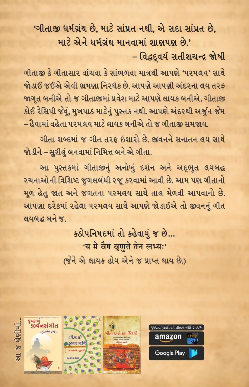 આ પુસ્તકમાં ગીતાજીનું અનોખું દર્શન અને અદ્ભુત લયબદ્ધ રચનાઓની વિશિષ્ટ જુગલબંધી રજૂ કરવામાં આવી છે. આમ પણ ગીતાનો મૂળ હેતુ જાત અને જગતના પરમલય સાથે તાલ મેળવી આપવાનો છે. આપણા દરેકમાં રહેલા પરમલય સાથે આપણે જોડાઈએ તો જીવનનું ગીત લયબદ્ધ બને જ.