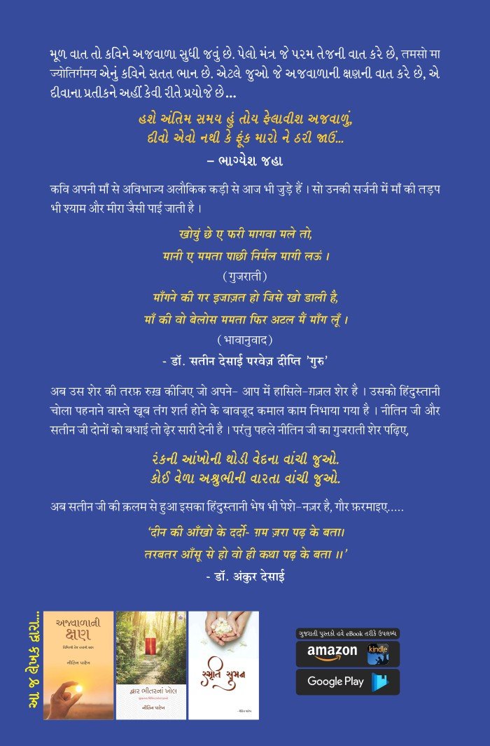 अब उस शेर की तरफ़ रुख़ कीजिए जो अपने- आप में हासिले-ग़ज़ल शेर है । उसको हिंदुस्तानी चोला पहनाने वास्ते खूब तंग शर्त होने के बावजूद कमाल काम निभाया गया है । नीतिन जी और सतीन जी दोनों को बधाई तो ढ़ेर सारी देनी है । परंतु पहले नीतिन जी का गुजराती शेर पढ़िए,