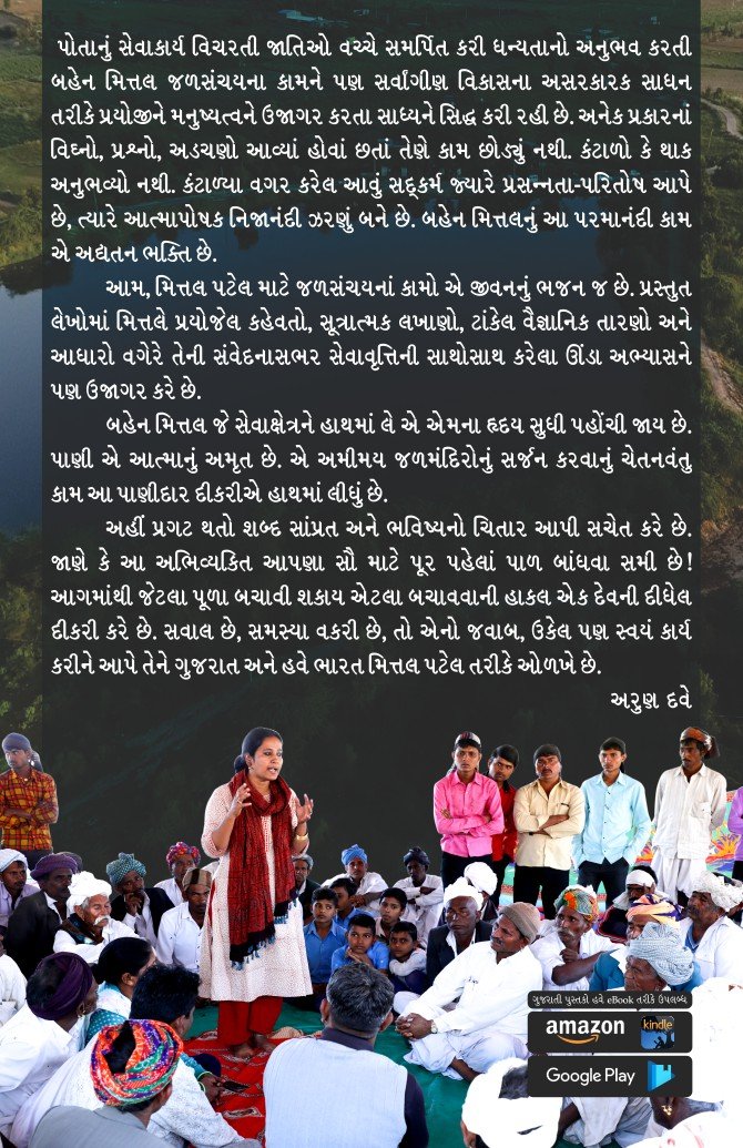 આમ, મિત્તલ પટેલ માટે જળસંચયનાં કામો એ જીવનનું ભજન જ છે. પ્રસ્તુત લેખોમાં મિત્તલે પ્રયોજેલ કહેવતો, સૂત્રાત્મક લખાણો, ટાંકેલ વૈજ્ઞાનિક તારણો અને આધારો વગેરે તેની સંવેદનાસભર સેવાવૃત્તિની સાથોસાથ કરેલા ઊંડા અભ્યાસને પણ ઉજાગર કરે છે.