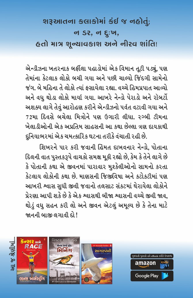 એન્ડીઝના ખતરનાક બર્ફીલા પહાડોમાં એક વિમાન તૂટી પડ્યું, પણ તેમાંના કેટલાક લોકો બચી ગયા અને પછી ચાલ્યો જિંદગી સામેનો જંગ. બે મહિના તે લોકો ત્યાં ફસાયેલા રહ્યા. વચ્ચે હિમપ્રપાત આવ્યો અને વધુ થોડા લોકો માર્યા ગયા. આખરે નેન્ડો પેરાડો અને રૉબર્ટો અશક્ય લાગે તેવું આરોહણ કરીને એન્ડીઝનો પર્વત વટાવી ગયા અને 72મા દિવસે બચેલા મિત્રોને પણ ઉગારી લીધા. રગ્બી ટીમના ખેલાડીઓની એક અપ્રતિમ સાહસની આ કથા છેલ્લા ત્રણ દાયકાથી દુનિયાભરમાં એક ચમત્કારિક ઘટના તરીકે વંચાતી રહી છે.