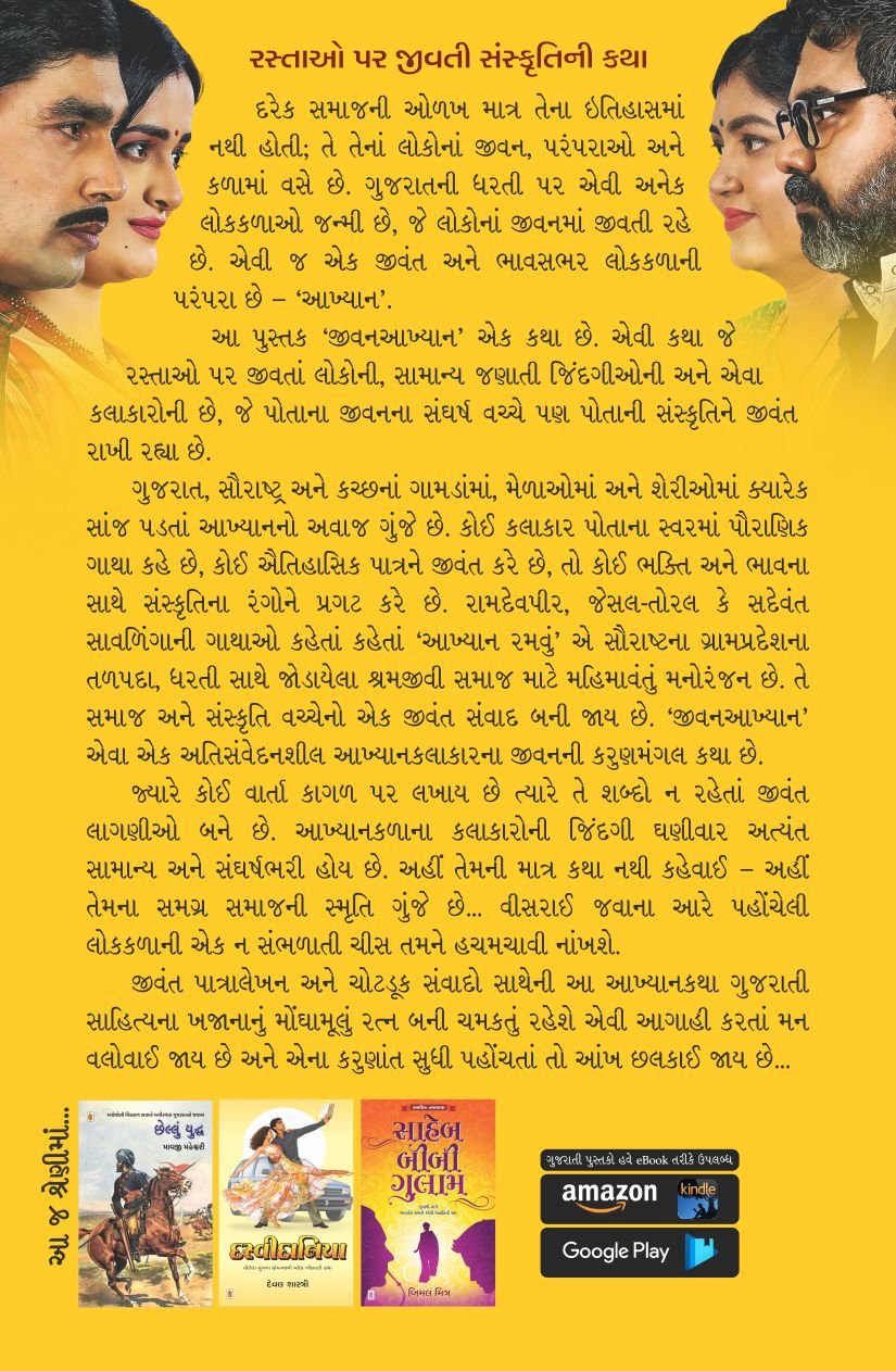 આ પુસ્તક ‘જીવનઆખ્યાન’ મૂળે એક કથા છે. એવી કથા જે રસ્તાઓ પર જીવતાં લોકોની છે, સામાન્ય જણાતી જિંદગીઓની છે અને એવા કલાકારોની છે, જે પોતાના જીવનના સંઘર્ષ વચ્ચે પણ પોતાની સંસ્કૃતિને જીવંત રાખવા માટે સતત પ્રયત્નશીલ રહે છે.