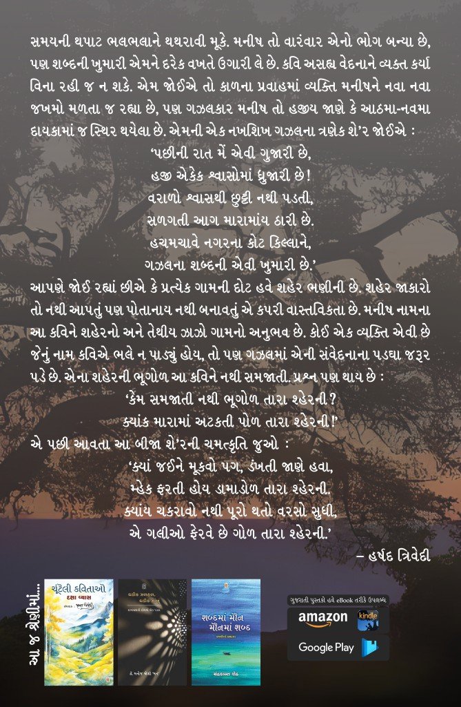 આપણે જોઈ રહ્યાં છીએ કે પ્રત્યેક ગામની દોટ હવે શહેર ભણીની છે. શહેર જાકારો તો નથી આપતું પણ પોતાનાય નથી બનાવતું એ કપરી વાસ્તવિકતા છે. મનીષ નામના આ કવિને શહેરનો અને તેથીય ઝાઝો ગામનો અનુભવ છે. કોઈ એક વ્યક્તિ એવી છે જેનું નામ કવિએ ભલે ન પાડ્યું હોય, તો પણ ગઝલમાં એની સંવેદનાના પડઘા જરૂર પડે છે. એના શહેરની ભૂગોળ આ કવિને નથી સમજાતી. પ્રશ્ન પણ થાય છે