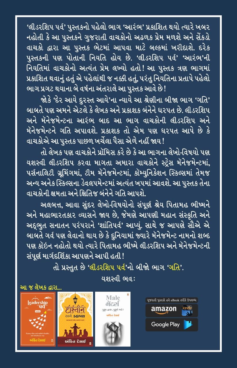 જોકે ‘દેર આયે દુરસ્ત આયે’ના ન્યાયે આ શ્રેણીના બીજા ભાગ ‘ગતિ’ બાબતે પણ અમને એટલે કે લેખક અને પ્રકાશક બંનેને ધરપત છે. લીડરશિપ અને મૅનેજમેન્ટના આરંભ બાદ આ ભાગ વાચકોની લીડરશિપ અને મૅનેજમેન્ટને ગતિ અપાવશે. પ્રકાશક તો એમ પણ ધરપત આપે છે કે વાચકોએ આ પુસ્તક પાછળ ખર્ચેલા પૈસા એળે નહીં જાય!
