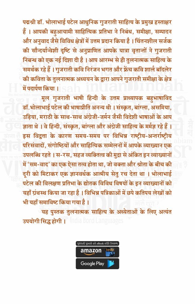 मूल गुजराती भाषी हिन्दी के उत्तम प्राध्यापक बहुभाषाविद डॉ.भोलाभाई पटेल की भाषाप्रीति अनन्य थी । संस्कृत, बांग्ला, असमिया, उड़िया, मराठी के साथ-साथ अंग्रेजी-जर्मन जैसी विदेशी भाषाओं के आप ज्ञाता थे । वे हिन्दी, संस्कृत, बांग्ला और अंग्रेजी साहित्य के मर्मज्ञ रहे हैं । इस विद्वत्ता के कारण समय-समय पर विभिन्न राष्ट्रीय-अन्तर्राष्ट्रीय परिसंवादों, संगोष्ठियों और साहित्यिक सम्मेलनों में आपके व्याख्यान एक उपलब्धि रहते । स-रस, सहज व्यक्तित्व की मुद्रा से अंकित इन व्याख्यानों में ‘सम-वाद’ का एक ऐसा तत्व होता था, जो वक्ता और श्रोता के बीच की दूरी को मिटाकर एक ज्ञानवर्धक आत्मीय सेतु रच देता था । भोलाभाई पटेल की विलक्षण प्रतिभा के द्योतक विविध विषयों के इन व्याख्यानों को यहाँ ग्रंथस्थ किया जा रहा है । विभिन्न पत्रिकाओं में छपे कतिपय लेखों को भी यहाँ समाविष्ट किया गया है ।