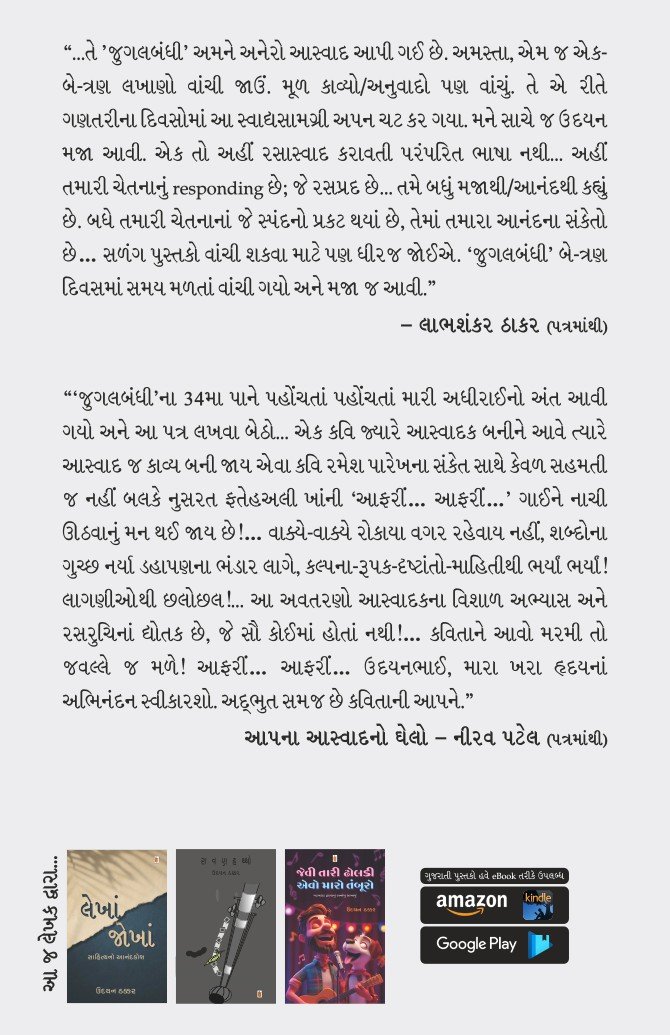 “‘જુગલબંધી’ના 34મા પાને પહોંચતાં પહોંચતાં મારી અધીરાઈનો અંત આવી ગયો અને આ પત્ર લખવા બેઠો… એક કવિ જ્યારે આસ્વાદક બનીને આવે ત્યારે આસ્વાદ જ કાવ્ય બની જાય એવા કવિ રમેશ પારેખના સંકેત સાથે કેવળ સહમતી જ નહીં બલકે નુસરત ફતેહઅલી ખાંની ‘આફરીં… આફરીં…’ ગાઈને નાચી ઊઠવાનું મન થઈ જાય છે!… વાક્યે-વાક્યે રોકાયા વગર રહેવાય નહીં, શબ્દોના ગુચ્છ નર્યા ડહાપણના ભંડાર લાગે, કલ્પના-રૂપક-દૃષ્ટાંતો-માહિતીથી ભર્યાં ભર્યાં! લાગણીઓથી છલોછલ!… આ અવતરણો આસ્વાદકના વિશાળ અભ્યાસ અને રસરુચિનાં દ્યોતક છે, જે સૌ કોઈમાં હોતાં નથી!… કવિતાને આવો મરમી તો જવલ્લે જ મળે! આફરીં… આફરીં… ઉદયનભાઈ, મારા ખરા હૃદયનાં અભિનંદન સ્વીકારશો. અદ્ભુત સમજ છે કવિતાની આપને.”