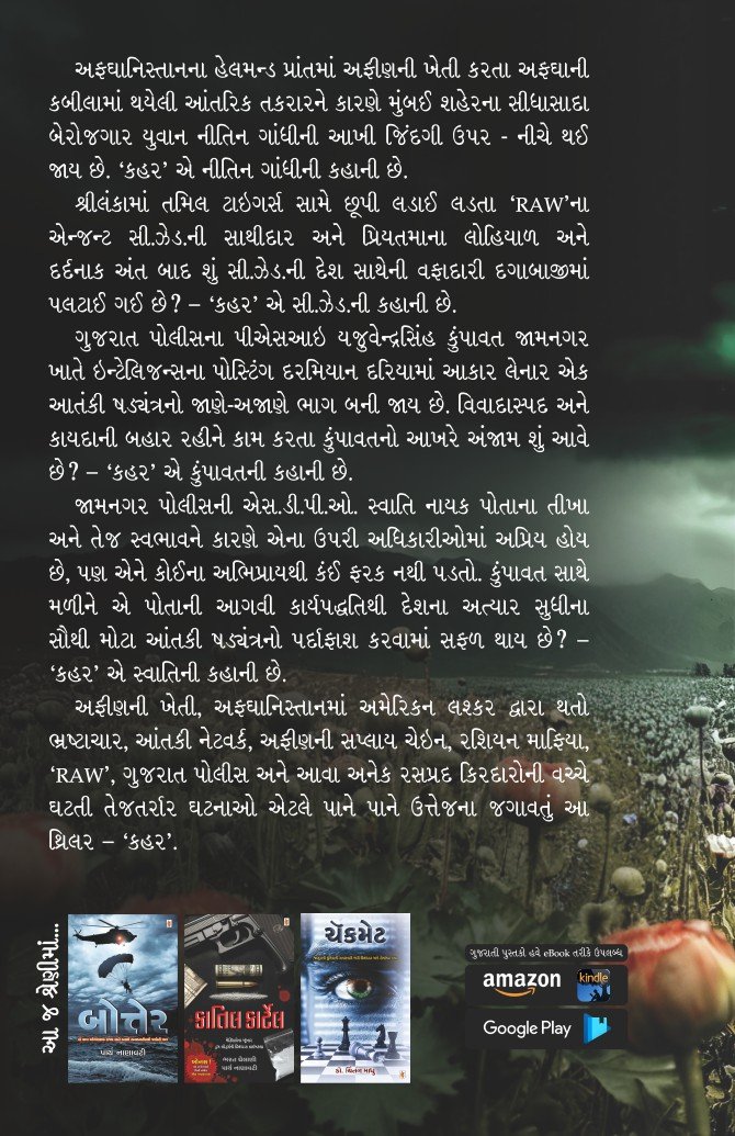 અફીણની ખેતી, અફઘાનિસ્તાનમાં અમેરિકન લશ્કર દ્વારા થતો ભ્રષ્ટાચાર, આંતકી નેટવર્ક, અફીણની સપ્લાય ચેઇન, રશિયન માફિયા, ‘RAW’, ગુજરાત પોલીસ અને આવા અનેક રસપ્રદ કિરદારોની વચ્ચે ઘટતી તેજતર્રાર ઘટનાઓ એટલે પાને પાને ઉત્તેજના જગાવતું આ થ્રિલર – ‘કહર’.