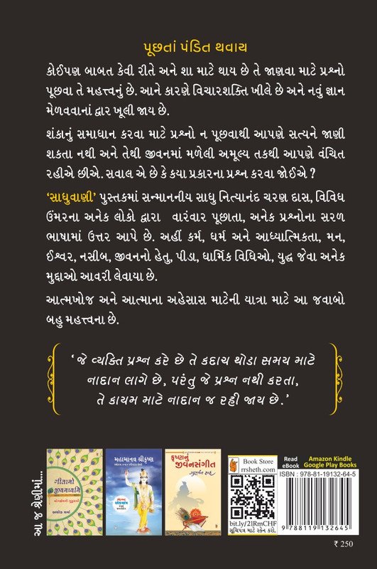 ‘સાધુવાણી’ પુસ્તકમાં સન્માનનીય સાધુ નિત્યાનંદ ચરણ દાસ, વિવિધ ઉંમરના અનેક લોકો દ્વારા વારંવાર પૂછાતા, અનેક પ્રશ્નોના સરળ ભાષામાં ઉત્તર આપે છે. અહીં કર્મ, ધર્મ અને આધ્યાત્મિકતા, મન, ઈશ્વર, નસીબ, જીવનનો હેતુ, પીડા, ધાર્મિક વિધિઓ, યુદ્ધ જેવા અનેક મુદ્દાઓ આવરી લેવાયા છે.