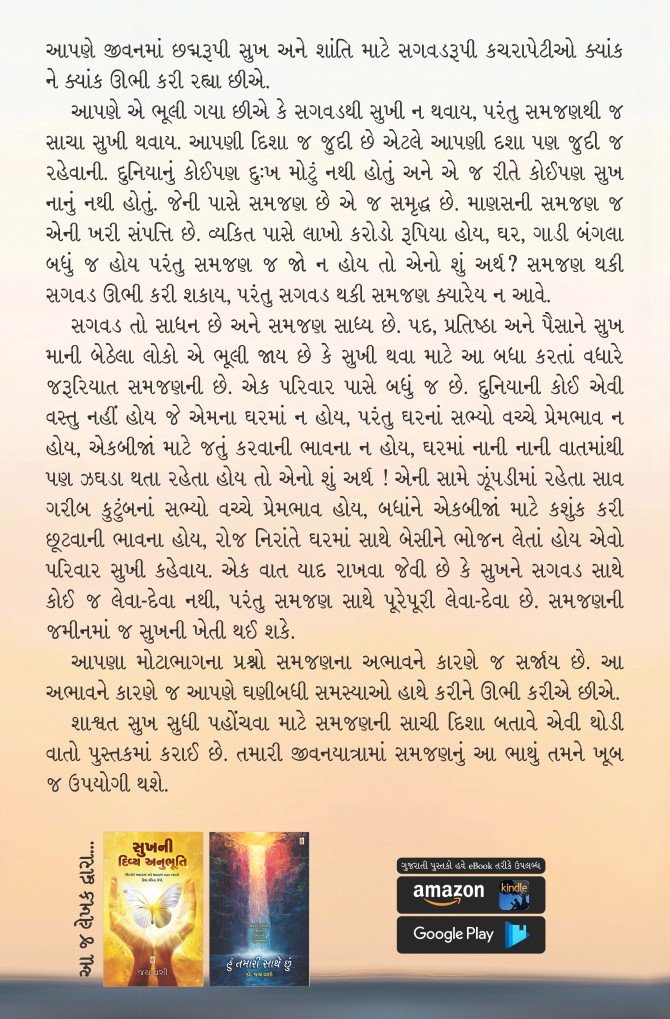 શાશ્વત સુખ સુધી પહોંચવા માટે સમજણની સાચી દિશા બતાવે એવી થોડી વાતો પુસ્તકમાં કરાઈ છે. તમારી જીવનયાત્રામાં સમજણનું આ ભાથું તમને ખૂબ જ ઉપયોગી થશે.