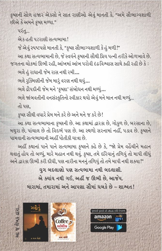 આ કથા સત્યભામાના કૃષ્ણની છે. આ કથામાં દ્વારકા છે, ગોકુળ છે, બરસાના છે, મથુરા છે, પાંચાલ છે તો વિદર્ભ પણ છે. આ સ્થળો સરનામાં નહીં, પડાવ છે. કૃષ્ણને પામવાની સત્યભામાની અહીં પોતીકી યાત્રા છે.