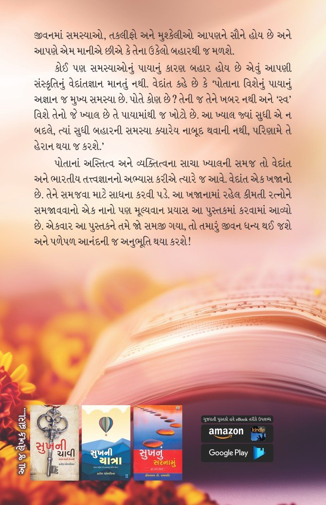 પોતાનાં અસ્તિત્વ અને વ્યક્તિત્વના સાચા ખ્યાલની સમજ તો વેદાંત અને ભારતીય તત્ત્વજ્ઞાનનો અભ્યાસ કરીએ ત્યારે જ આવે. વેદાંત એક ખજાનો છે. તેને સમજવા માટે સાધના કરવી પડે. આ ખજાનામાં રહેલ કીમતી રત્નોને સમજાવવાનો એક નાનો પણ મૂલ્યવાન પ્રયાસ આ પુસ્તકમાં કરવામાં આવ્યો છે. પણ જો એકવાર આ પુસ્તકને તમે સમજી ગયા, તો તમારું જીવન ધન્ય થઈ જશે અને પળેપળ આનંદની જ અનુભૂતિ થયા કરશે!