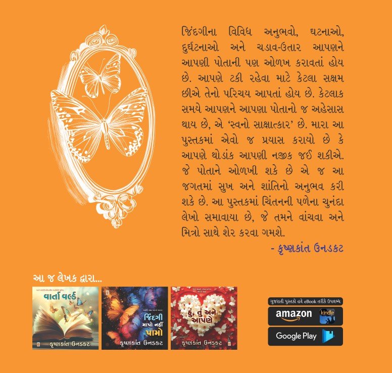 જિંદગીના અનુભવો, જિંદગીની ઘટનાઓ, જિંદગીની દુર્ઘટનાઓ અને જિંદગીના ચડાવ-ઉતાર આપણને આપણી પણ ઓળખ કરાવતા હોય છે. આપણે ટકી રહેવા માટે કેટલા સક્ષમ છીએ તેનો પરિચય આપતા હોય છે. કેટલાક સમયે આપણને આપણા પોતાનો જ અહેસાસ થાય છે, એ `સ્વનો સાક્ષાત્કાર’ છે. મારા આ પુસ્તકમાં એવો જ પ્રયાસ કરાયો છે કે આપણે થોડાક આપણી નજીક જઈ શકીએ. જે પોતાને ઓળખી શકે છે એ જ આ જગતમાં સુખ અને શાંતિનો અનુભવ કરી શકે છે. આ પુસ્તકમાં ચિંતનની પળેના ચુનંદા લેખો સમાવાયા છે, જે આપને ગમશે.