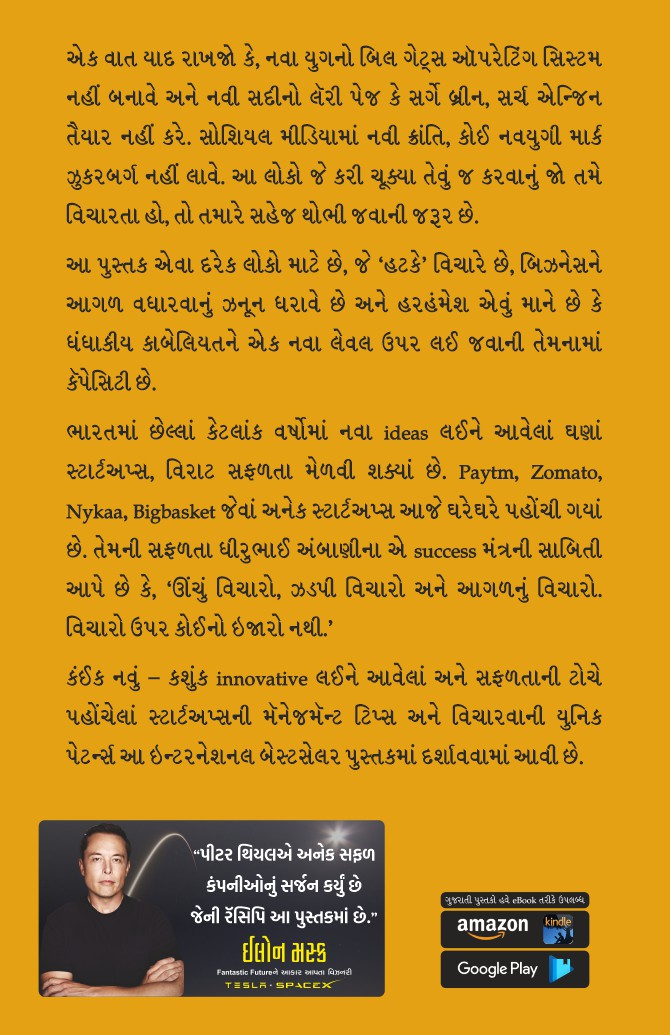 એક વાત યાદ રાખજો કે, નવા યુગનો બિલ ગેટ્સ ઑપરેટિંગ સિસ્ટમ નહીં બનાવે અને નવી સદીનો લૅરી પેજ કે સર્ગે બ્રીન, સર્ચ એન્જિન તૈયાર નહીં કરે. સોશિયલ મીડિયામાં નવી ક્રાંતિ, કોઈ નવયુગી માર્ક ઝુકરબર્ગ નહીં લાવે. આ લોકો જે કરી ચૂક્યા તેવું જ કરવાનું જો તમે વિચારતા હો, તો તમારે સહેજ થોભી જવાની જરૂર છે. આ પુસ્તક એવા દરેક લોકો માટે છે, જે ‘હટકે’ વિચારે છે, બિઝનેસને આગળ વધારવાનું ઝનૂન ધરાવે છે અને હરહંમેશ એવું માને છે કે ધંધાકીય કાબેલિયતને એક નવા લેવલ ઉપર લઈ જવાની તેમનામાં કૅપેસિટી છે. ભારતમાં છેલ્લાં કેટલાંક વર્ષોમાં નવા ideas લઈને આવેલાં ઘણાં સ્ટાર્ટઅપ્સ, વિરાટ સફળતા મેળવી શક્યાં છે. PayTm, Zomato, Nykaa, Bigbasket જેવાં અનેક સ્ટાર્ટઅપ્સ આજે ઘરેઘરે પહોંચી ગયાં છે. તેમની સફળતા ધીરુભાઈ અંબાણીના એ success મંત્રની સાબિતી આપે છે કે, ‘ઊંચું વિચારો, ઝડપી વિચારો અને આગળનું વિચારો. વિચારો ઉપર કોઈનો ઇજારો નથી.’ કંઈક નવું – કશુંક innovative લઈને આવેલાં અને સફળતાની ટોચે પહોંચેલાં સ્ટાર્ટઅપ્સની મૅનેજમૅન્ટ ટિપ્સ અને વિચારવાની યુનિક પેટર્ન્સ આ ઇન્ટરનેશનલ બેસ્ટસેલર પુસ્તકમાં દર્શાવવામાં આવી છે. ‘પીટર થિયલે અનેક સફળ કંપનીઓનું સર્જન કર્યું છે જેની રૅસિપિ આ પુસ્તકમાં છે.’